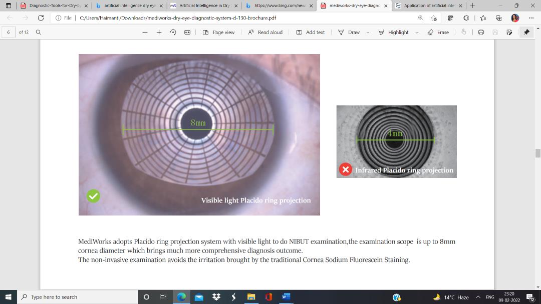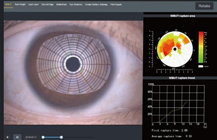 We used the novel AI derived dry eye analyzer (Dry eye diagnostic system, Mediworks) to assess the NIBUT. It uses Placido ring projection system with visible light to do NIBUT examination. The examination scope is up to 8mm corneal diameter which brings much more comprehensive diagnostic outcome. It notes image distortion and time from opening the eyes to the first sign of image distortion. After taking one video, it automatically acquires the first break up time, average break up time, break up distribution, break up area, percentage curve and time distribution.