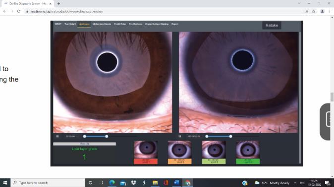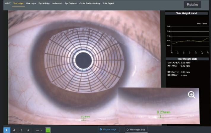 A video is taken and AI identification system depicts Tear Meniscus area and measures the tear height automatically with a built in ruler. It is measured in line with the pupil centre. It evaluates tear secretion amount and continuity objectively. Normal tear meniscus height is ≥0.2mm.