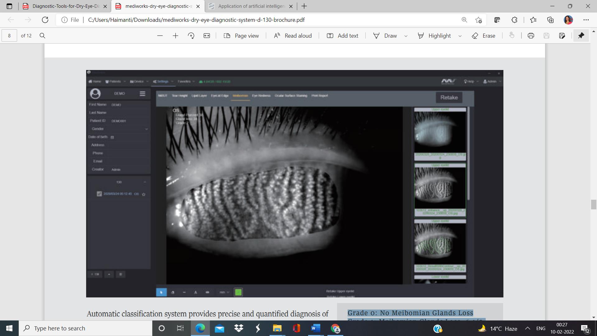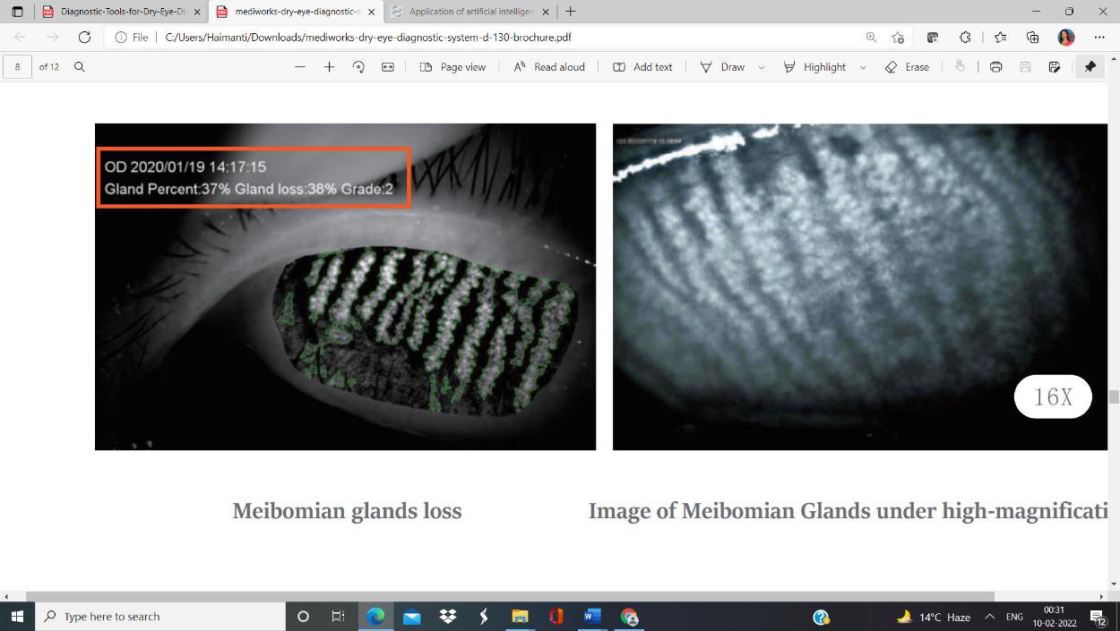 Meibomian gland disease is a major, and perhaps the most common, etiologic factor in the pathogenesis of many subtypes of DED. Clinical diagnosis is often limited to examination of the lid margin by slit lamp to assess the degree of inspissation and telangiectasias, as well as subjective assessment of meibomian gland openings and meibum quality. techniques. Recently, infrared based non-contact imaging modalities of meibomian gland have offered detailed imaging to guide the diagnosis and treatment of MGD-related DED. Unique Built-in infrared lighting system provides a larger scope of capturing Meibomian gland image of both upper and lower lids.