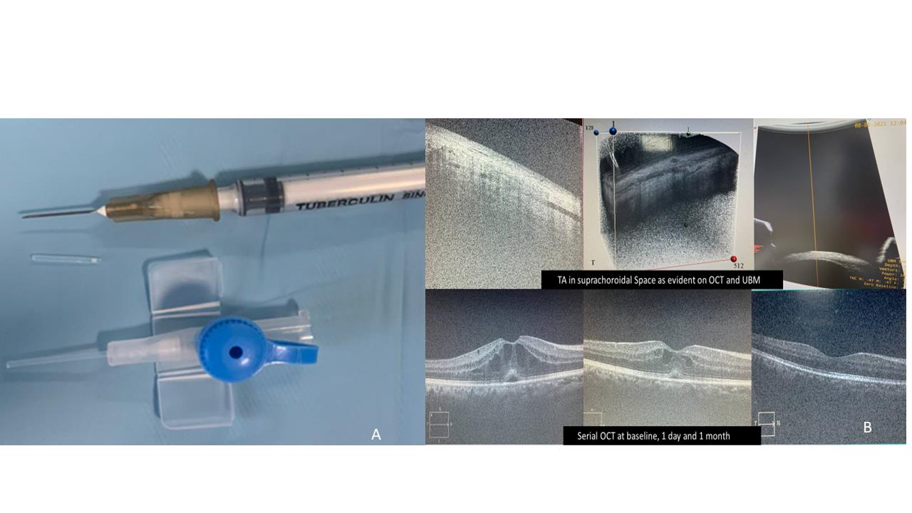 Fig 1 A The outer sheath of intracath is cut and used to cover the 26-gauge needle till the bevelled edge 1 B Optical coherence tomography showing TA deposited in suprachoroidal space (Upper pane) and completely resolved CME (Lower pane)